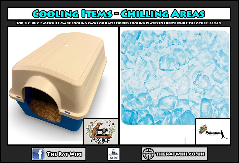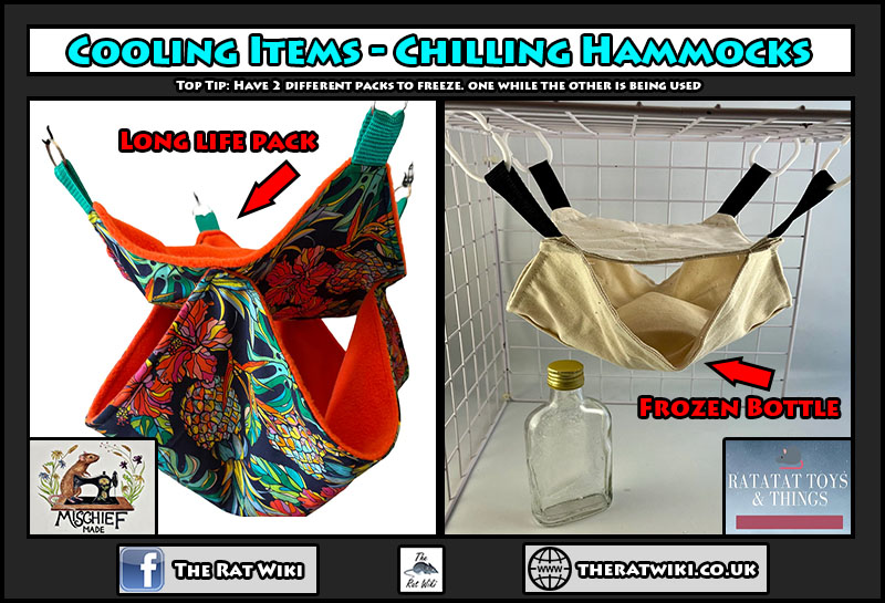 Cooling Hammocks – Sold by Mischief Made & Ratatat Toys & Things these specially made hammocks have a little Velcro chamber in just underneath where the rats lay where you can insert either a frozen water bottle or cooling tile (Both Provided) and this should gently cool the bottom of the hammock for them for a couple of hours. Buying a spare of each means you can quickly switch these out and keep a frozen on on the go at all times.