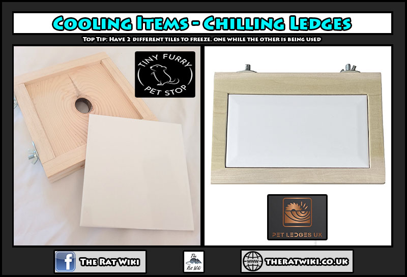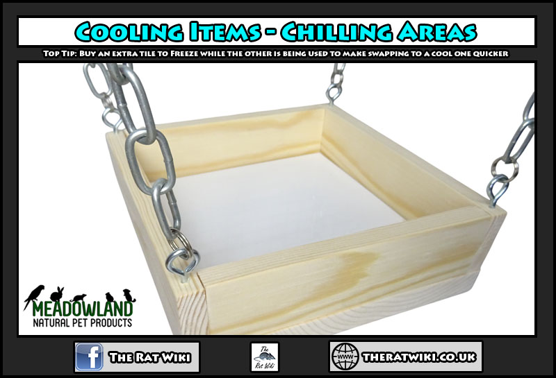 Cooling Perch with Tile – These perches are available from Tiny Furry Pet Stop and Pet Ledges UK and have a section cut out of the top where a Ceramic tile can fit in which you can pre cool and as the rats are moving about their cage they can choose to sit/lay on this in passing and cool down. There is a notch cut out underneath to easily push it out to change.