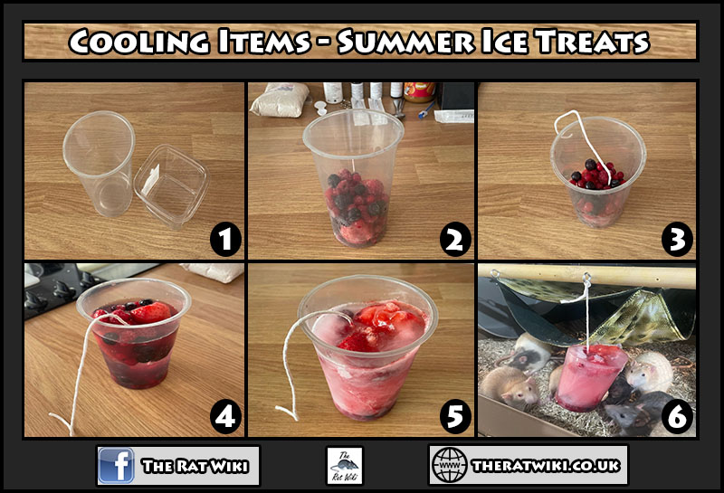 Make Frozen Popsicles – Mix some frozen fruits in with water and either put in a popsicle tube or you can even use a small container and dip string in to freeze to hang in the cage. Very enriching for the rats and the frozen treat should last them quite a while