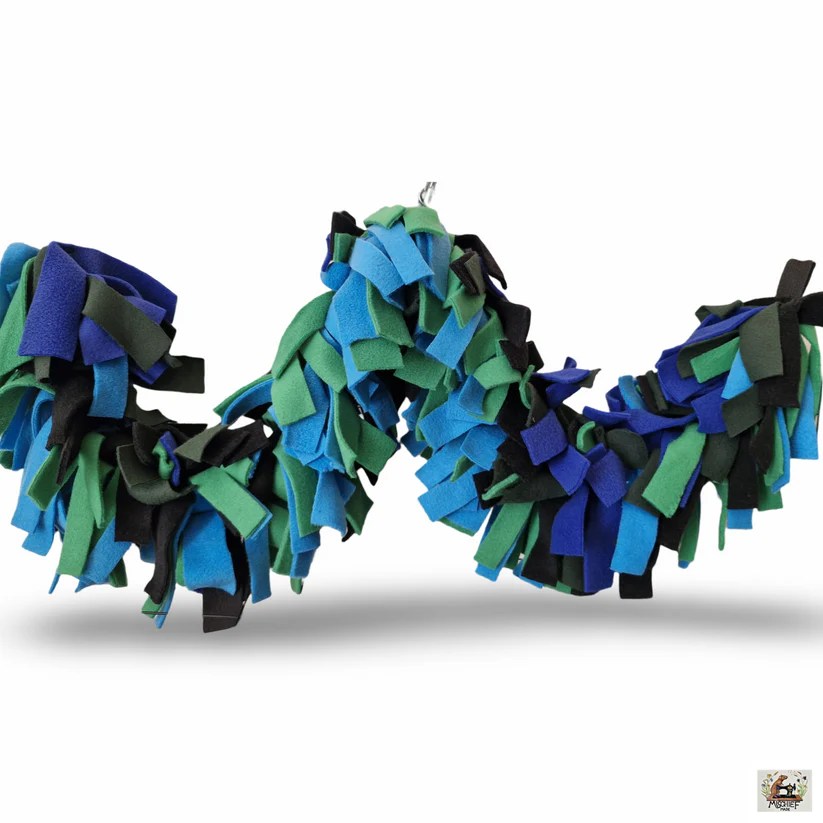 Ropes are a fantastic addition to any cage. They have lots of uses including providing walkways between areas, challenges balancing skills and can also help “clutter” up a cage and fill in empty spaces. Ropes are quite soft too especially the hand plaited ones or the enrichment ropes made out of fleece so provide a soft landing and an easy place to grab hold of and stop a fall. Even the tougher dog style ropes are still a much better thing to land on than something like a solid wooden perch so filling in any open areas with ropes will help make your cage safer. Lots of the small businesses on The Rat Wiki website sell ropes. Good examples of variety include the Plaited Ropes from RattieAngels and the Enrichment Rope from Mischief Made which is a large rope with hundreds of pieces of fleece attached to it for them to pull off and make beds with. Normal ropes designed for dogs can be used too and can often be found in places like B&M and the Range.