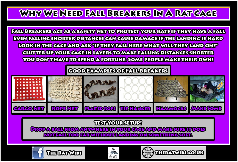 Fall breakers are one of the most important things to consider in a cage when setting it up. Not only are they ways to “clutter up” the cage more and connect various other items together but most importantly they act as a safety net to catch your rats if they misstep or are pushed off somewhere high up in the cage. Even falling a little way can cause major injury if they land on something solid so when you’re setting up your cage you need to make sure there is something to catch them or something for them to grab hold of to soften the landing.