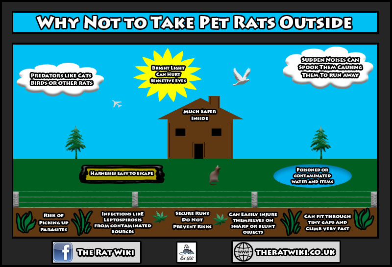 There is a big risk of picking up unwanted things you can’t even see when exposed to the outside world. The potential to pick up internal or external parasites is quite high and most of the time there will be no obvious symptoms for you to tell. They will need to be treated every time they are exposed to this which isn’t ideal at all. Common infections like Leptospirosis can be picked up from contaminated outside sources like water and soil and also wild rats can spread it in their urine. This can then be spread to your other rats, any other animals in your household and also to humans. In humans this can turn into Weils disease that presents as cold/flu like symptoms but has also been known to be fatal in bad cases.
