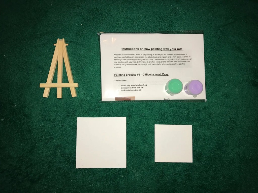 A mini paw painting kit for your pet rats! This kit comes with everything you need for some painting fun. It includes canvasses, a mini easel (perfect for displaying a mini painting) kids paint colors and a written guide for 2 separate ways of paw painting with your rats/mice.