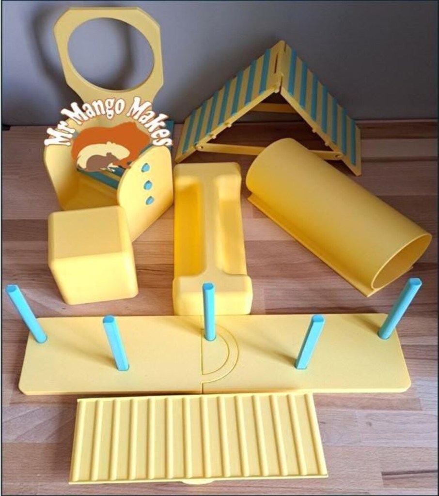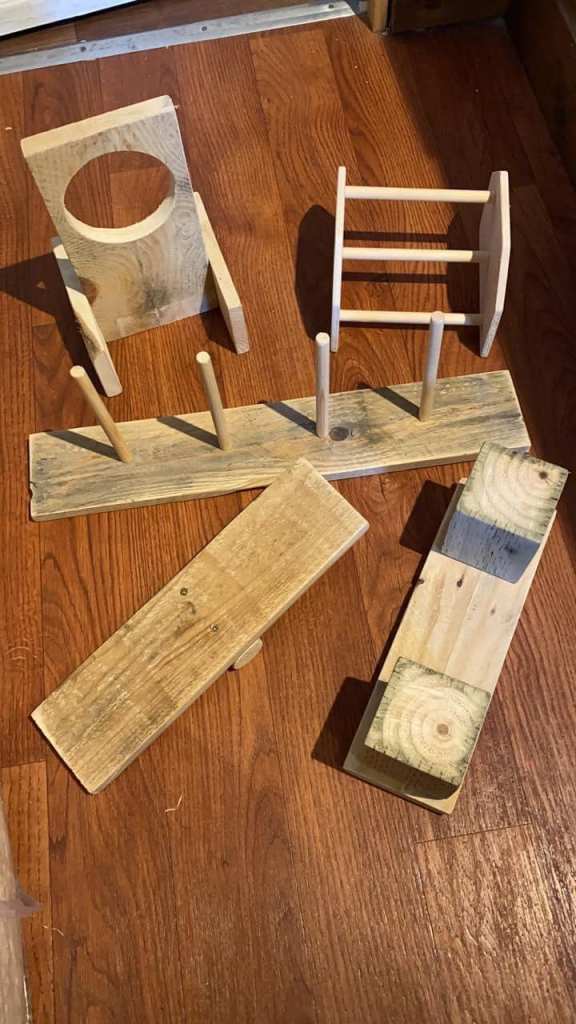 A handmade rat agility set. This is sanded smooth and screwed into place, no glue involved! Each set contains a hurdle, seesaw, weave poles, high jump and long jump.”
