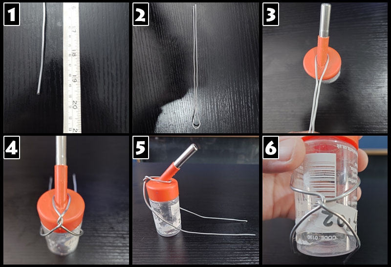 4) Twist the wires over each other so they land on the same side they started and bend these over the edge of the bottle lid and around the bottle