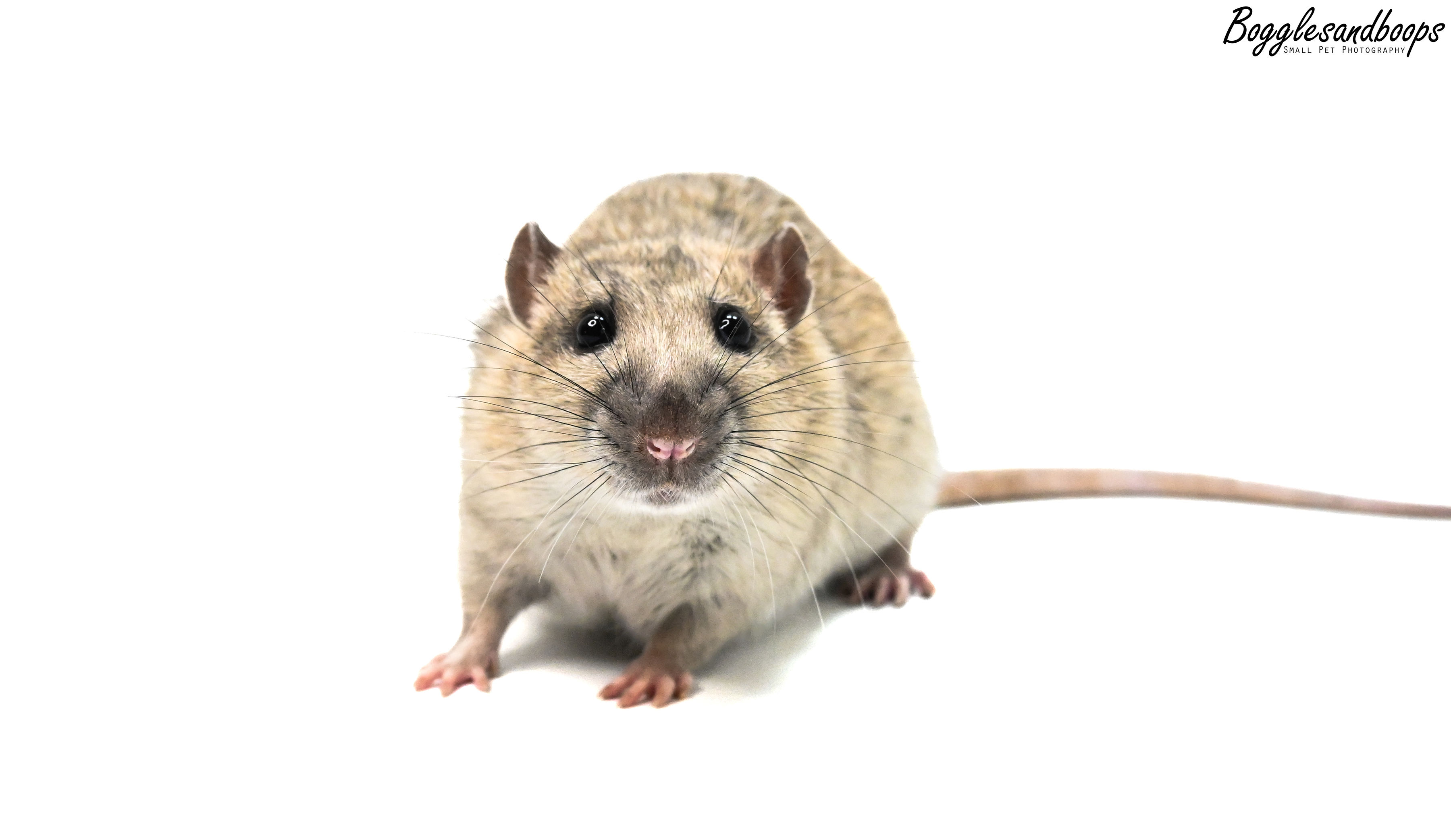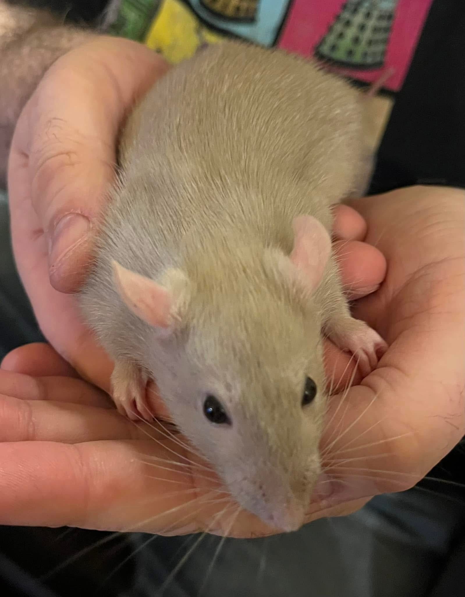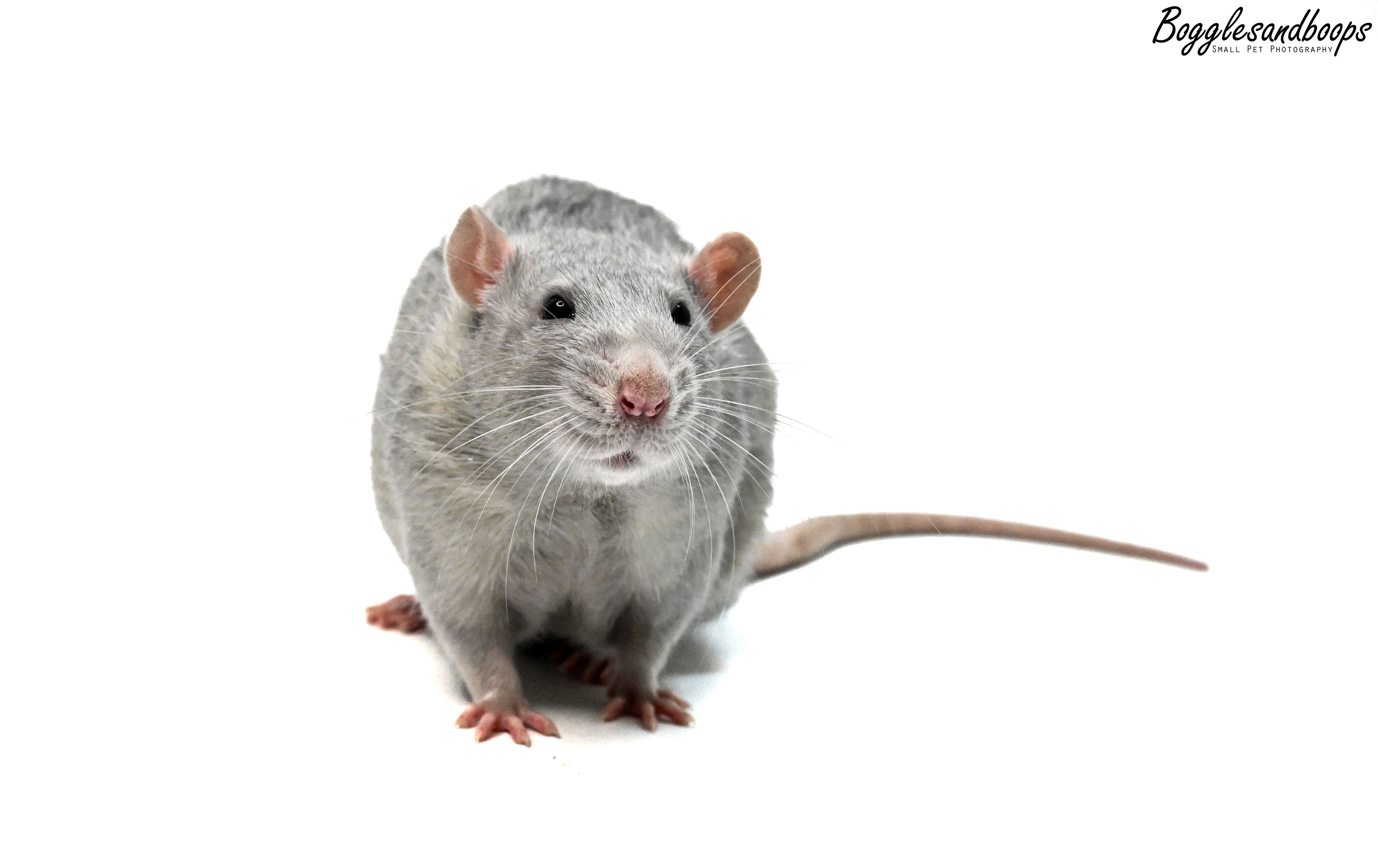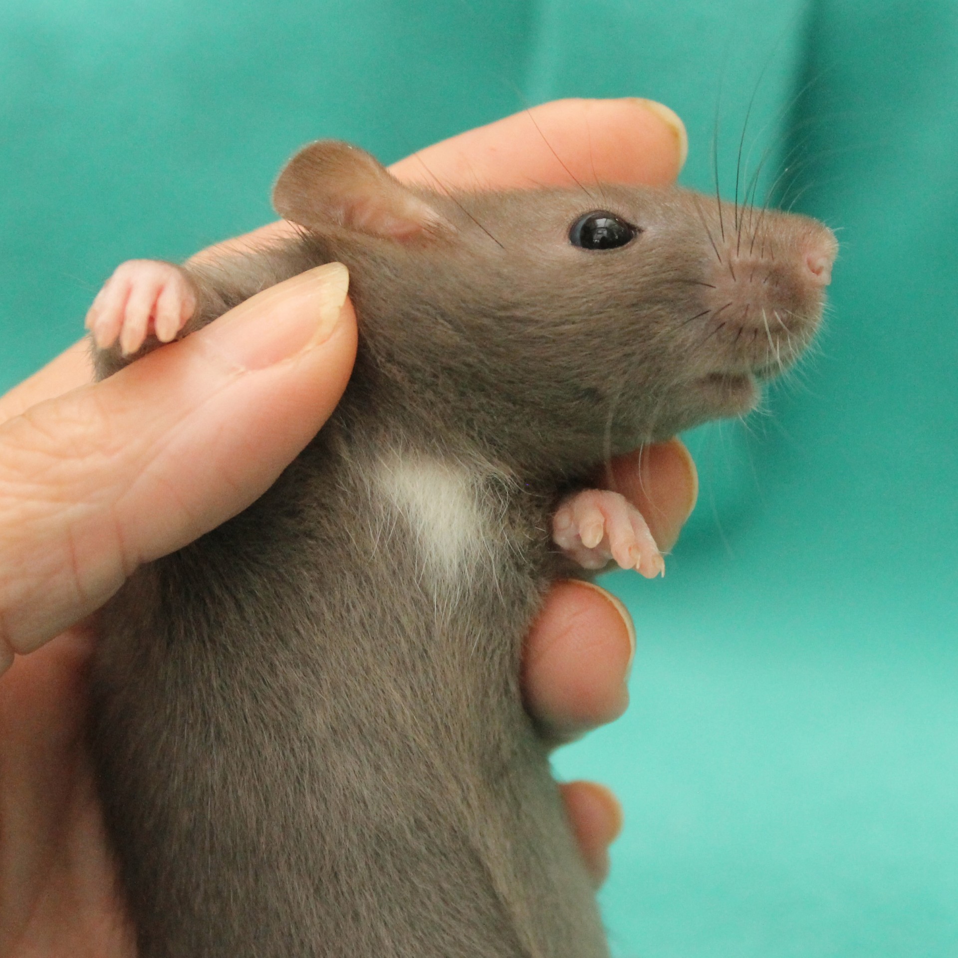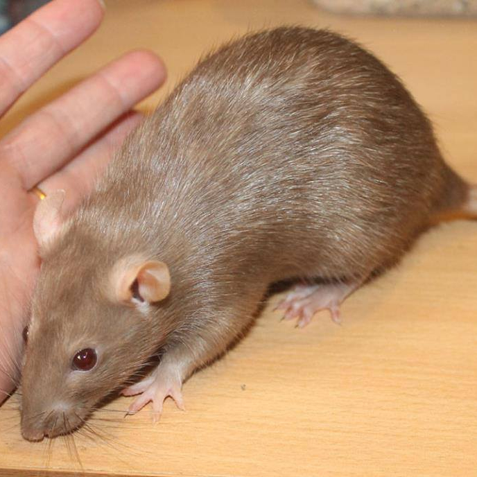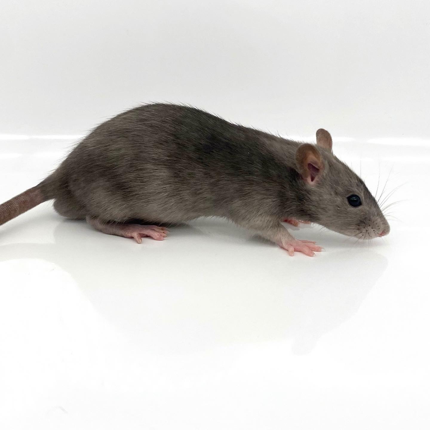 Description: To be less than half the size of a standard fancy rat but easily distinguished from a small example of same. All varieties recognised for other rats to be accepted. Head to be shapely, similar to a standard rat but finer boned and pointed at the muzzle. Eyes big, round and bold with a good width between the ears. Ears to be large and well-shaped. Body to show good length but slightly more rounded over the loin. This may give the appearance of a chopped rump but the bones of the pelvis should not be prominent to the touch. The tail will not be as long or thick in comparison with a standard rat, but nor should it be square-shaped or excessively thin; the bones should not be visible. The tail will typically be held high during movement.