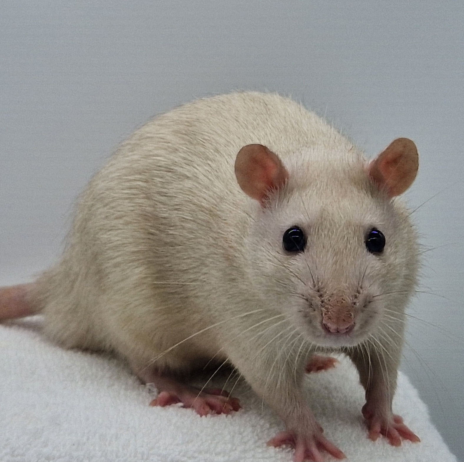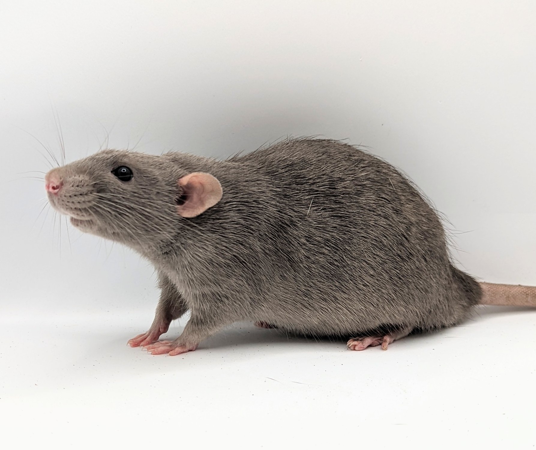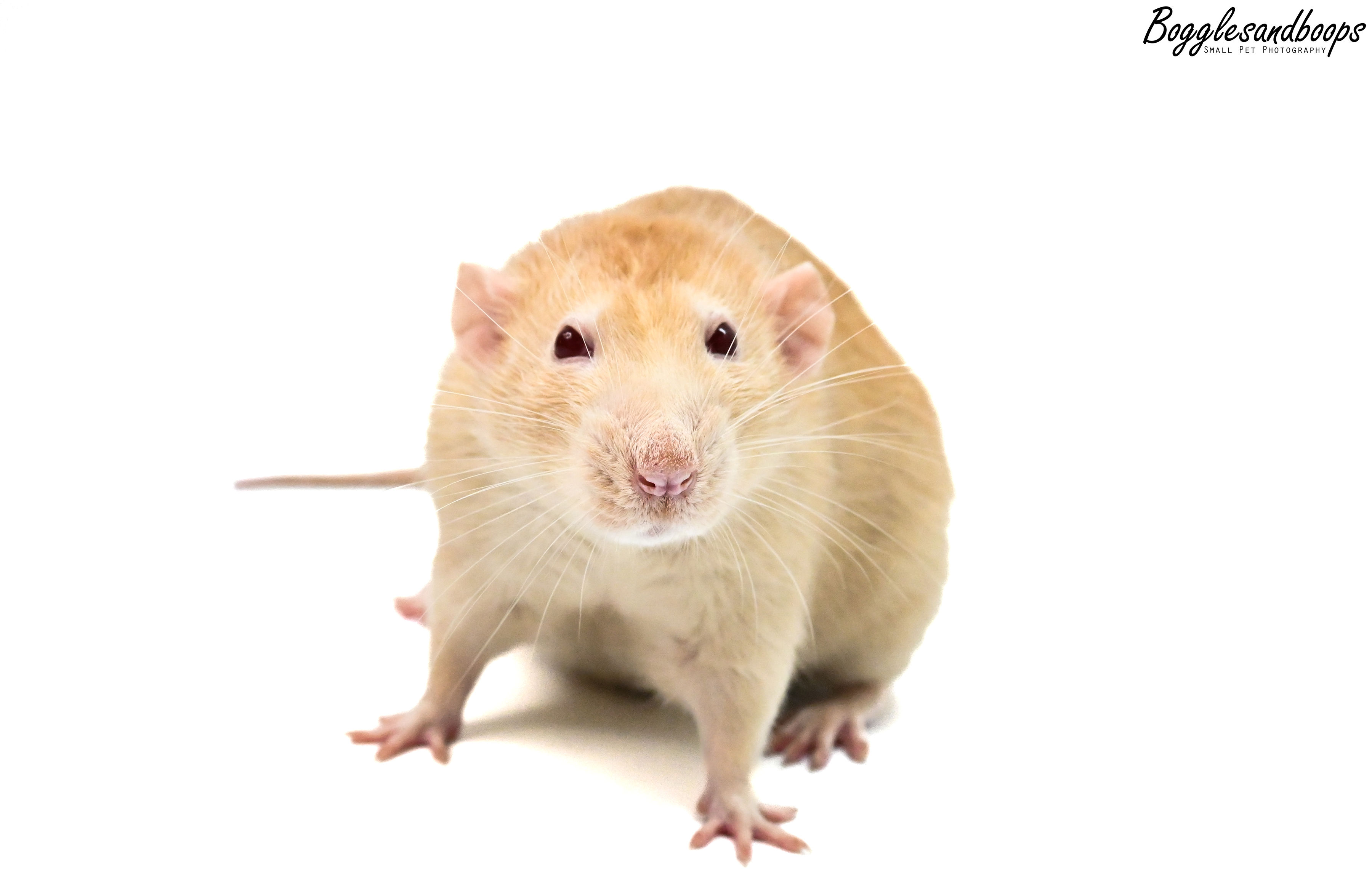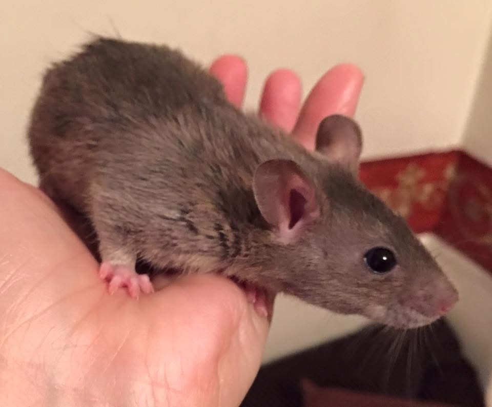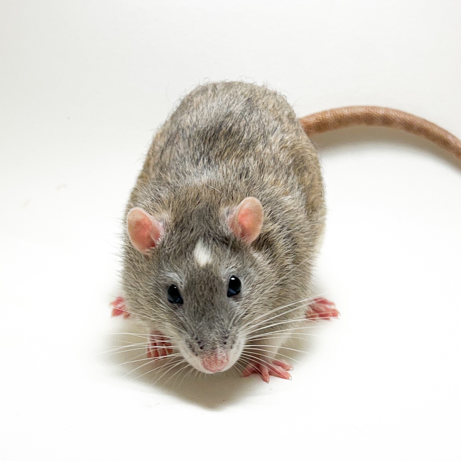 Description: To be less than half the size of a standard fancy rat but easily distinguished from a small example of same. All varieties recognised for other rats to be accepted. Head to be shapely, similar to a standard rat but finer boned and pointed at the muzzle. Eyes big, round and bold with a good width between the ears. Ears to be large and well-shaped. Body to show good length but slightly more rounded over the loin. This may give the appearance of a chopped rump but the bones of the pelvis should not be prominent to the touch. The tail will not be as long or thick in comparison with a standard rat, but nor should it be square-shaped or excessively thin; the bones should not be visible. The tail will typically be held high during movement.