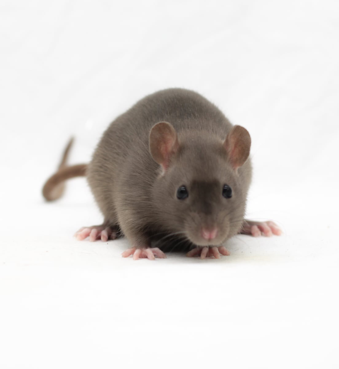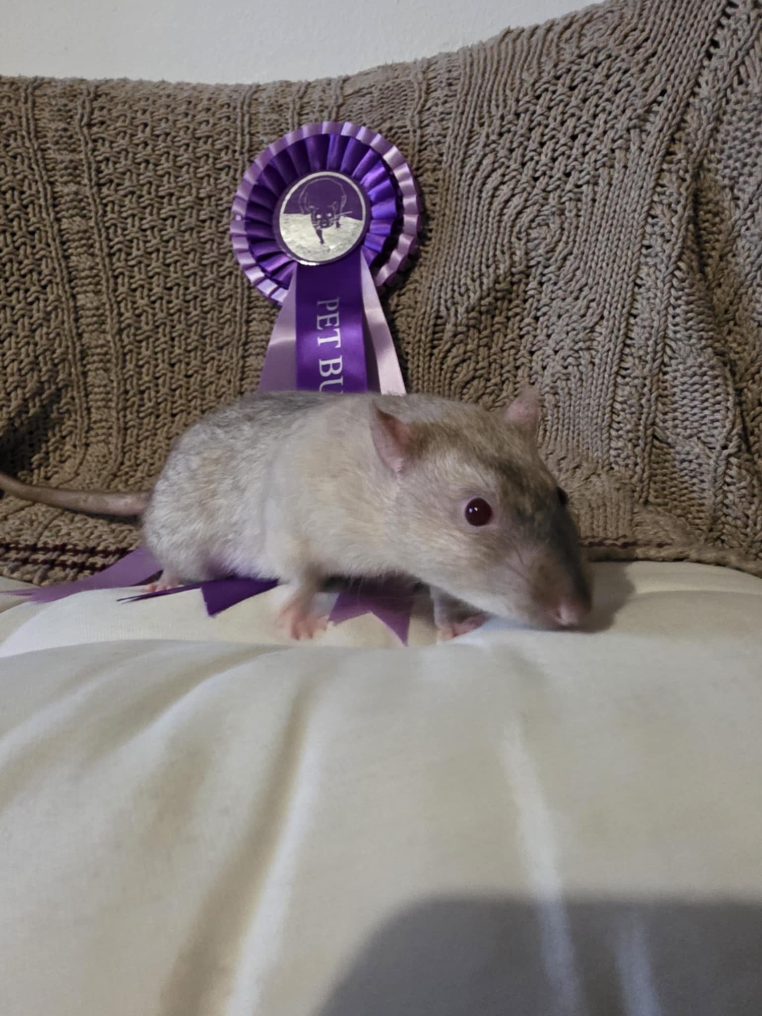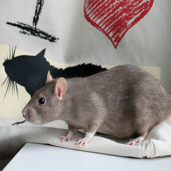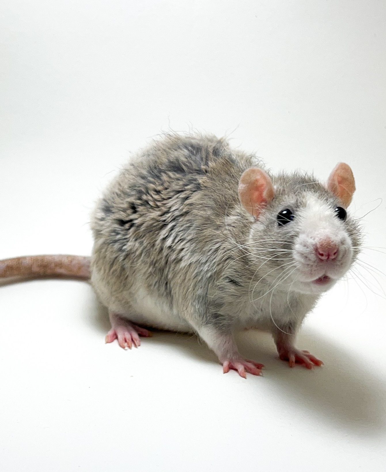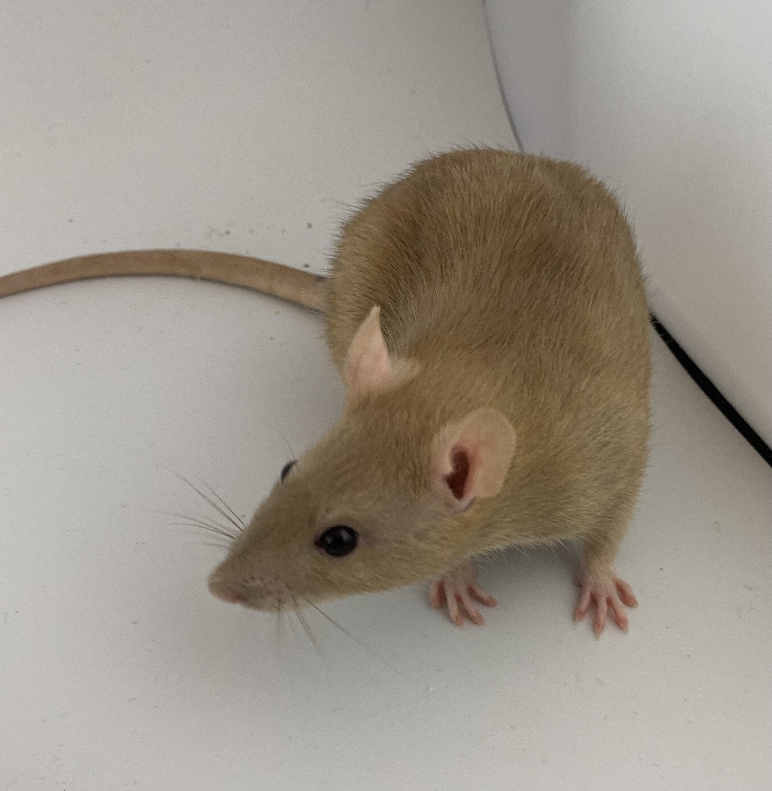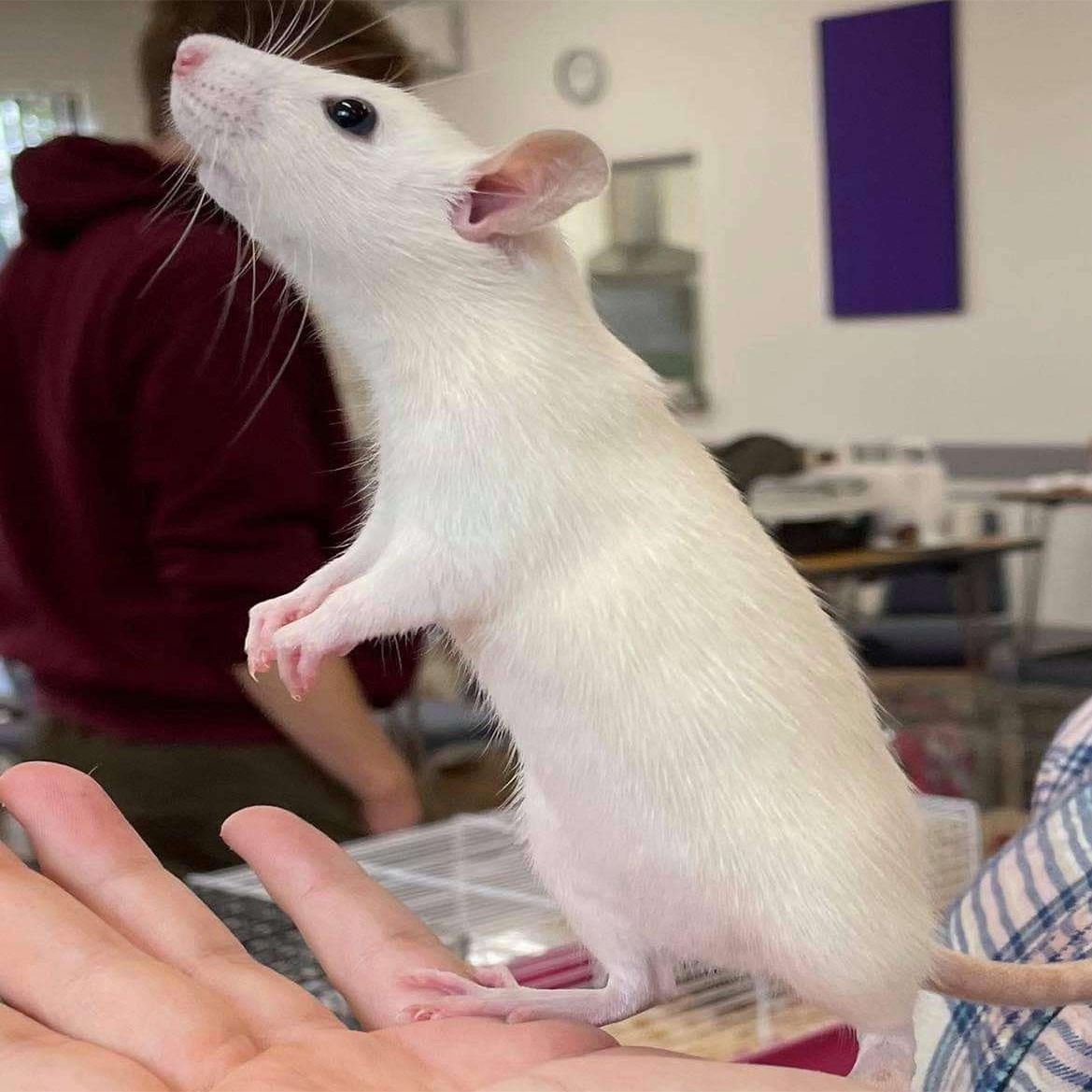 Description: To be less than half the size of a standard fancy rat but easily distinguished from a small example of same. All varieties recognised for other rats to be accepted. Head to be shapely, similar to a standard rat but finer boned and pointed at the muzzle. Eyes big, round and bold with a good width between the ears. Ears to be large and well-shaped. Body to show good length but slightly more rounded over the loin. This may give the appearance of a chopped rump but the bones of the pelvis should not be prominent to the touch. The tail will not be as long or thick in comparison with a standard rat, but nor should it be square-shaped or excessively thin; the bones should not be visible. The tail will typically be held high during movement.