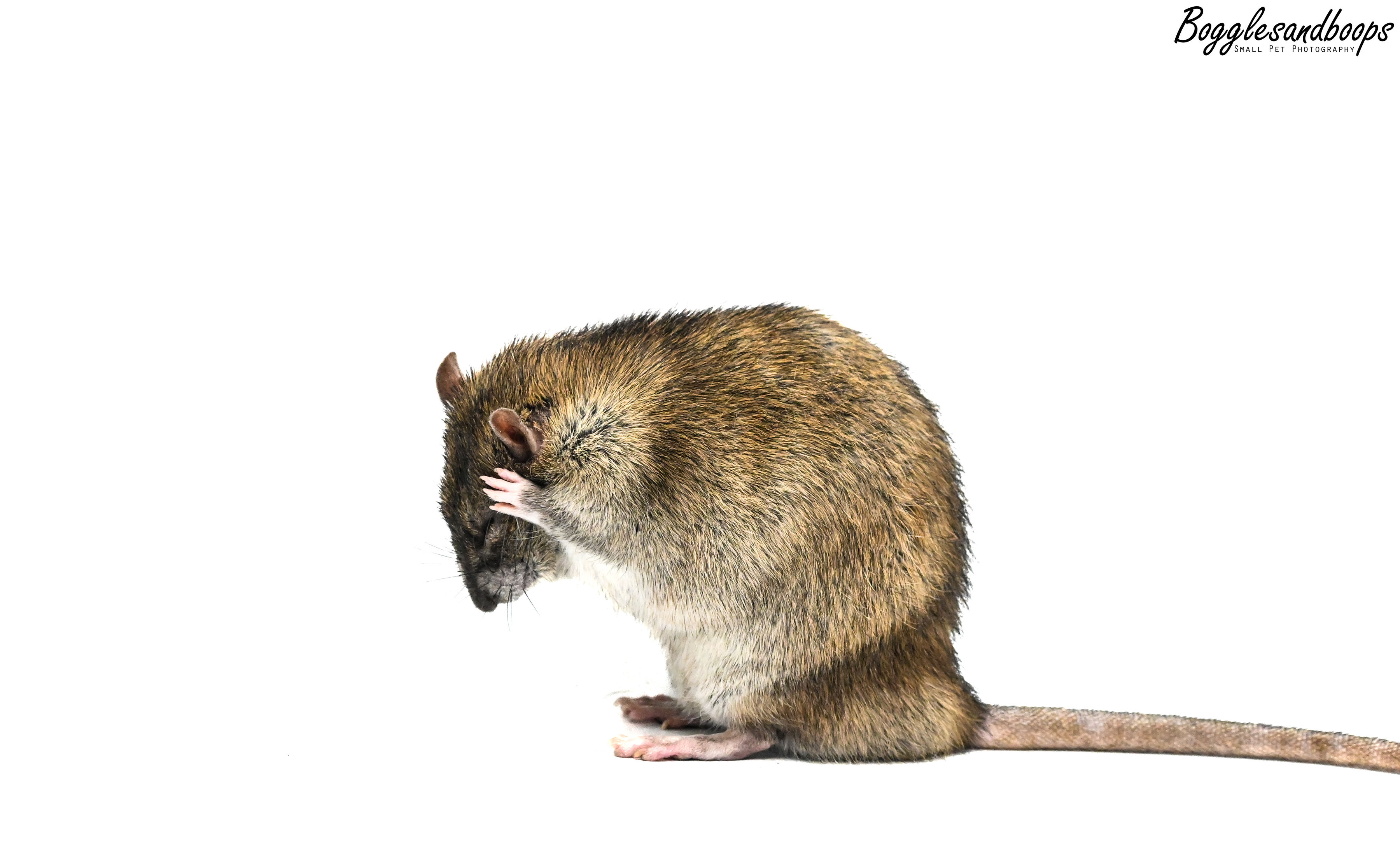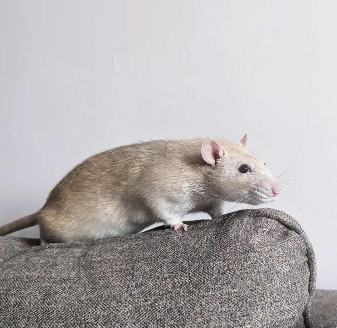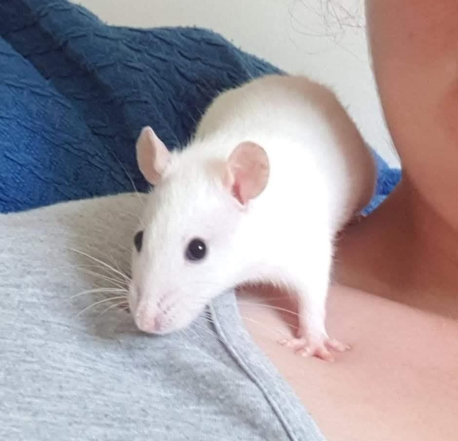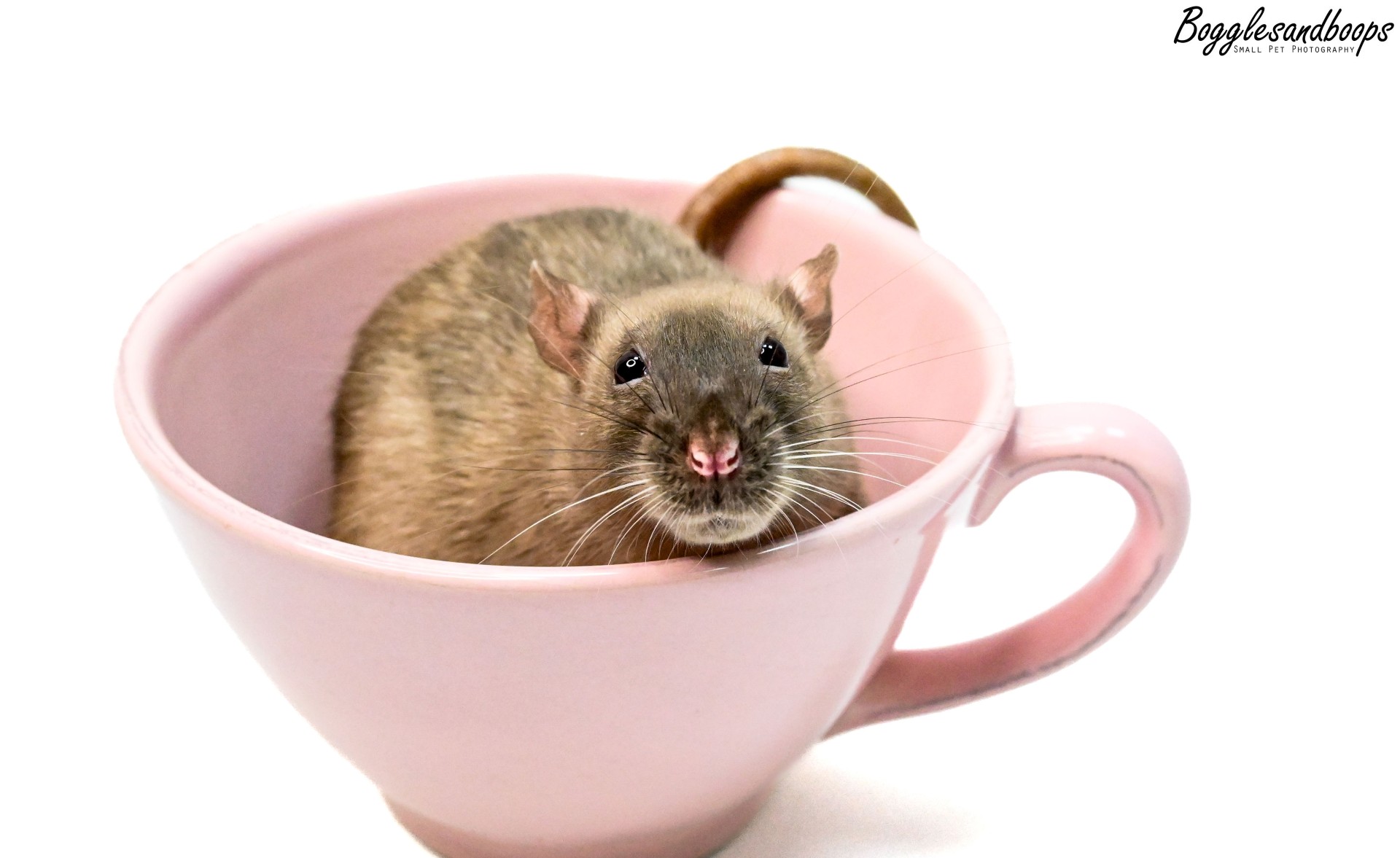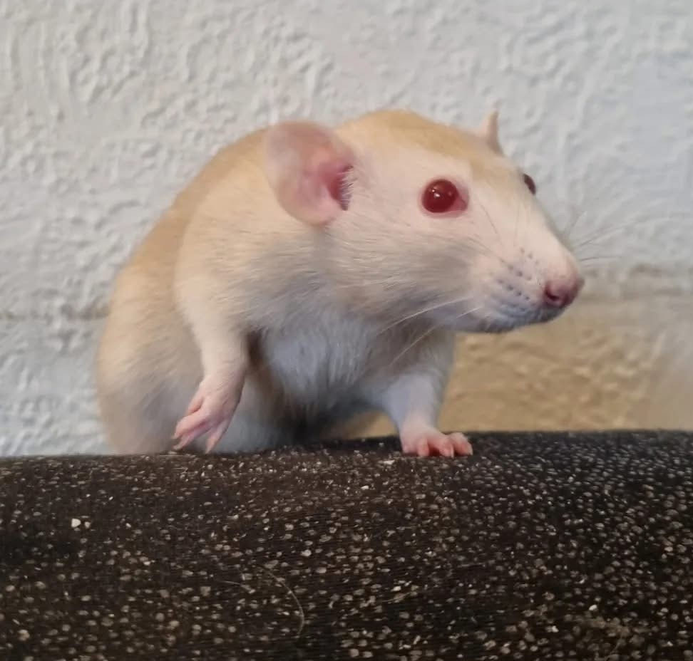 Description: To be less than half the size of a standard fancy rat but easily distinguished from a small example of same. All varieties recognised for other rats to be accepted. Head to be shapely, similar to a standard rat but finer boned and pointed at the muzzle. Eyes big, round and bold with a good width between the ears. Ears to be large and well-shaped. Body to show good length but slightly more rounded over the loin. This may give the appearance of a chopped rump but the bones of the pelvis should not be prominent to the touch. The tail will not be as long or thick in comparison with a standard rat, but nor should it be square-shaped or excessively thin; the bones should not be visible. The tail will typically be held high during movement.