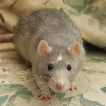 Description: Top colour grey, caused by the intermingling of black guard hairs over a pearl white ground. The whole to give a sparkling appearance. Undercolour dark slate blue, intermediate portion pearl, tips black. The entire underside to be white with a clear demarcation between top colour and belly. Head markings may be present or absent. Where present either a blaze or a spot to be acceptable. Head spots to be centrally placed on the rat’s forehead and no bigger than the rat’s eye. Blaze to be a wedge shaped symmetrical blaze of white starting at the nose and extending up the face to the forehead. The blaze to cover the whisker bed and to taper to a fine point midway between the eyes and the ears. Markings not to extend onto the cheeks or the eyes. Forelegs to be white to half their length, back feet white to the ankle (hock or tarsal bone). Tails to be pied.