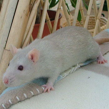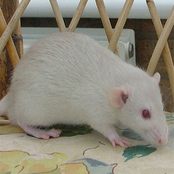 Description: Body colour to be very pale creamy white all over with no odd coloured hairs or patches. The exception is the skin on the underside of the scrotum which is normally greyish black, rarely flesh coloured. Tail pink. Ears usually covered with pale grey fur, rarely flesh covered.