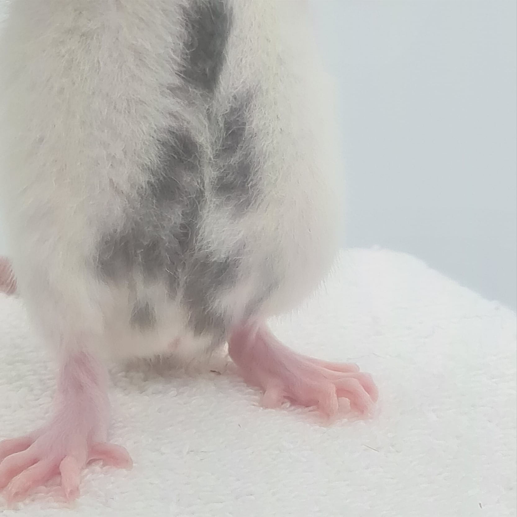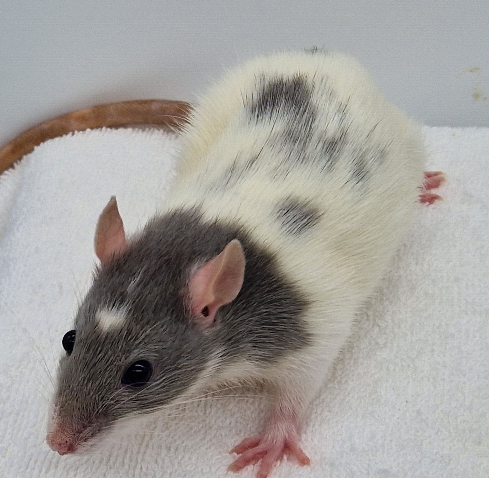 Description: The head and shoulders to be of a distinct colour with a white spot or blaze on the forehead. Where a spot is present this should be centrally placed on the forehead, round or oval in shape and no bigger than the rat’s eye. Blazes are a wedge shaped symmetrical blaze of white, starting at the nose and taper to a fine point midway between the eyes and ears. Markings not to extend onto the cheeks or the eyes. The rest of the upper portion (back, sides and tail) of the rat’s body to be white, evenly marked with patches and flecks of distinct colour, the colour to conform to a recognised colour variety. Underside should have a broken marked centre line down the belly. Side spots desirable.